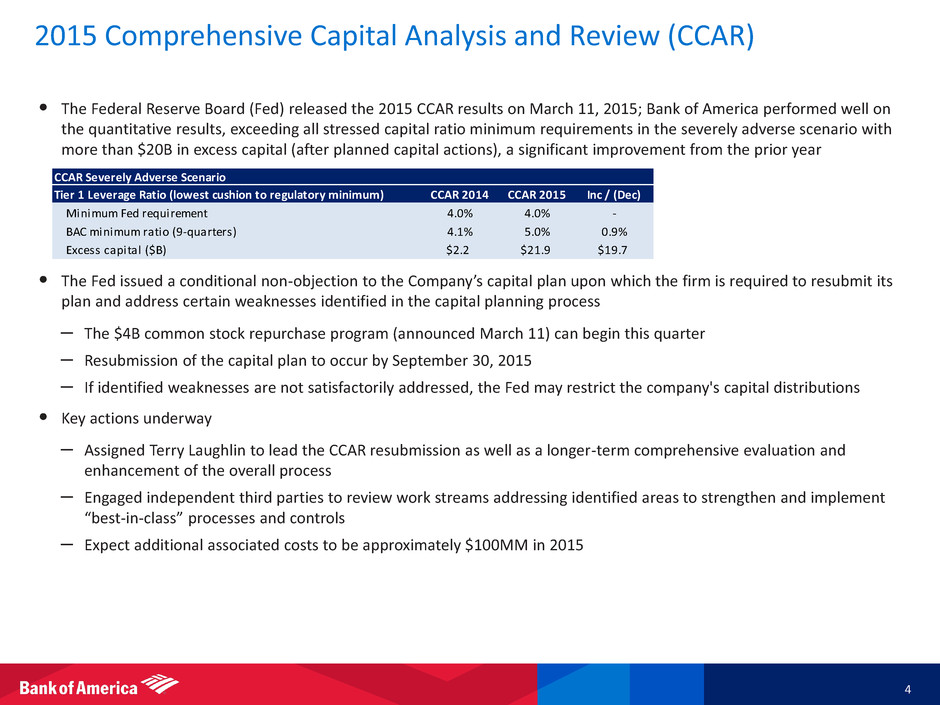 $1,468 $729 $1,291 $1,243 ($4,880) ($197) $1,475 $651 $1,365 $933 ($238) ($841) Consumer Banking Global Wealth & Investment Management Global Banking Global Markets (excl. net DVA / FVA) Legacy Assets & Servicing (LAS) All Other 1Q14 1Q15 1Q15 ROAAC 1 22% 16% 11% 21% Business Results Net Income (Loss) ($MM) and Return on Average Allocated Capital (ROAAC) (%) 1 ____________________ 1 Represents a non-GAAP financial measure. For important presentation information, see slide 31. 2 Represents a non-GAAP financial measure; see note A on slide 29. 2 3