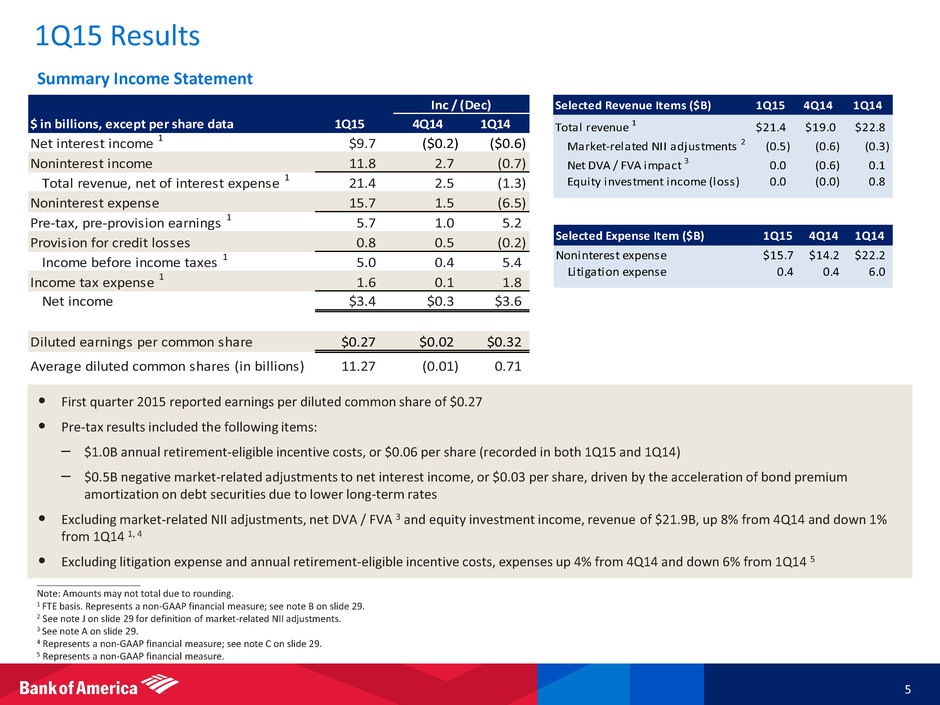 2015 Comprehensive Capital Analysis and Review (CCAR) 4 • The Federal Reserve Board (Fed) released the 2015 CCAR results on March 11, 2015; Bank of America performed well on the quantitative results, exceeding all stressed capital ratio minimum requirements in the severely adverse scenario with more than $20B in excess capital (after planned capital actions), a significant improvement from the prior year • The Fed issued a conditional non-objection to the Company’s capital plan upon which the firm is required to resubmit its plan and address certain weaknesses identified in the capital planning process – The $4B common stock repurchase program (announced March 11) can begin this quarter – Resubmission of the capital plan to occur by September 30, 2015 – If identified weaknesses are not satisfactorily addressed, the Fed may restrict the company's capital distributions • Key actions underway – Assigned Terry Laughlin to lead the CCAR resubmission as well as a longer-term comprehensive evaluation and enhancement of the overall process – Engaged independent third parties to review work streams addressing identified areas to strengthen and implement “best-in-class” processes and controls – Expect additional associated costs to be approximately $100MM in 2015 Tier 1 Leverage Ratio (lowest cushion to regulatory minimum) CCAR 2014 CCAR 2015 Inc / (Dec) Minimum Fed requirement 4.0% 4.0% - BAC inimum ratio (9-quarters) 4.1 5.0 0.9% Excess capital ($B) $2.2 $21.9 $19.7 CCAR Severely Adverse Scenario