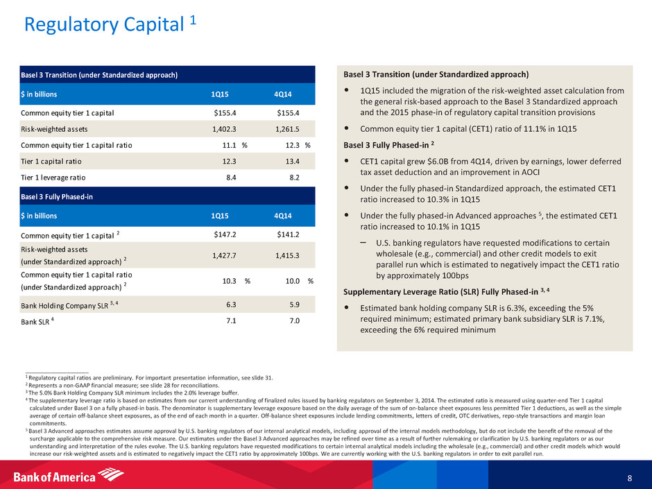 Loans & Leases (EOP, $B) 7 ____________________ Note: Amounts may not total due to rounding. 1 Represents a non-GAAP financial measure. GWIM Consumer Banking Global Banking 85 86 86 89 84 38 38 38 38 39 47 46 46 46 45 5 7 8 10 12 20 20 20 19 20 $195 $197 $198 $202 $200 $0 $50 $100 $150 $200 $250 1Q14 2Q14 3Q14 4Q14 1Q15 U.S. consumer credit card Auto and specialty lending Home equity Residential mortgage Other 152 152 151 156 159 67 67 67 65 68 45 43 42 41 43 25 25 25 26 25 $290 $287 $285 $289 $296 $0 $75 $150 $225 $300 $375 1Q14 2Q14 3Q14 4Q14 1Q15 U.S. C&I Non-U.S. C&I CRE Commercial leasing Loans & Leases (excl. LAS & All Other) 1 Total Loans & Leases LAS & All Other $916 $912 $891 $881 $878 $0 $250 $500 $750 $1,000 1Q14 2Q14 3Q14 4Q14 1Q15 213 205 188 173 160 37 36 34 33 32 $251 $241 $223 $206 $192 $0 $100 $200 $300 1Q14 2Q14 3Q14 4Q14 1Q15 All Other LAS 393 393 388 389 401 272 277 280 286 286 $665 $670 $668 $676 $686 $0 $250 $500 $750 1Q14 2Q14 3Q14 4Q14 1Q15 Commercial Consumer 49 49 50 51 52 7 7 6 6 6 23 24 24 25 26 35 37 38 40 40 3 3 3 3 3 $0 $25 $50 $75 $100 $125 $150 1Q14 2Q14 3Q14 4Q14 1Q15 Residential mortgage Home equity Structured lending Securities-based lending Credit card / Other 52 6 35 37 38 40 40 23 24 24 25 26 2 4 4 $116 $120 $122 $125 $128 1Q 2Q 3Q 4Q14 1Q15 si ti l rtg g ity Sec rities-based lending Structured lending re it car / t er