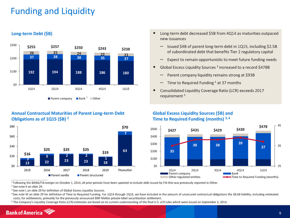 Notes 29 Non-GAAP Financial Measures For reconciliations to GAAP financial measures, see the accompanying reconciliations in the earnings press release and other earnings-related information. A In 4Q14, a funding valuation adjustment (FVA) on uncollateralized derivative transactions was implemented, and a transitional charge of $497MM related to the adoption was recorded. Net DVA / FVA represents the combined total of net DVA on derivatives and structured liabilities, and the FVA transitional charge recorded in 4Q14. Net DVA / FVA results were gains (losses) of $19MM, ($626MM), $205MM, $69MM and $112MM for 1Q15, 4Q14, 3Q14, 2Q14 and 1Q14, respectively. B On a GAAP basis, net interest income (NII) was $9.5B, $9.6B and $10.1B; total revenue, net of interest expense was $21.2B, $18.7B and $22.6B; pre-tax, pre-provision earnings were $5.5B, $4.5B and $0.3B; income before income taxes was $4.7B, $4.3B and ($0.7B); and income tax expense was $1.4B, $1.3B and ($0.4B) for 1Q15, 4Q14 and 1Q14, respectively. C On a GAAP basis, total revenue, net of interest expense was $21.2B, $18.7B and $22.6B for 1Q15, 4Q14 and 1Q14, respectively. Market-related adjustments of premium amortization expense and hedge ineffectiveness were ($0.5B), ($0.6B) and ($0.3B); net DVA / FVA results were gains (losses) of $19MM, ($626MM) and $112MM; and equity investment income (loss) was $27MM, ($20MM) and $784MM for 1Q15, 4Q14 and 1Q14, respectively. D On a GAAP basis, reported NII was $9.5B, $9.6B, $10.2B, $10.0B and $10.1B for 1Q15, 4Q14, 3Q14, 2Q14 and 1Q14, respectively. Market-related adjustments of premium amortization expense and hedge ineffectiveness were ($0.5B), ($0.6B), ($0.1B), ($0.2B) and ($0.3B) for 1Q15, 4Q14, 3Q14, 2Q14 and 1Q14, respectively. E LAS noninterest expense was $1.2B, $1.4B and $7.4B in 1Q15, 4Q14 and 1Q14, respectively. LAS litigation expense was $179MM, $256MM and $5.8B in 1Q15, 4Q14 and 1Q14, respectively. F Net charge-offs exclude write-offs of PCI loans of $288MM, $13MM, $246MM, $160MM and $391MM for 1Q15, 4Q14, 3Q14, 2Q14 and 1Q14, respectively. Including the write-offs of PCI loans, total annualized net charge-offs and PCI write-offs as a percentage of total average loans and leases outstanding were 0.70%, 0.40%, 0.57%, 0.55% and 0.79% for 1Q15, 4Q14, 3Q14, 2Q14 and 1Q14, respectively. G Adjusted net charge-offs exclude DoJ settlement impacts of $230MM and $151MM in 1Q15 and 4Q14, and recoveries from NPL sales and other recoveries of $40MM, $314MM, $114MM and $185MM in 1Q15, 4Q14, 3Q14 and 2Q14, respectively. H The allowance/annualized net charge-offs and PCI write-offs ratios were 2.28x, 4.08x, 2.95x, 3.20x and 2.30x, and the allowance (excluding valuation allowance for PCI loans)/annualized net charge-offs (excluding PCI loans) ratios were 2.55x, 3.66x, 3.27x, 3.25x and 2.58x, which excludes valuation allowance on PCI loans of $1.3B, $1.7B, $1.6B, $1.8B and $2.1B for 1Q15, 4Q14, 3Q14, 2Q14 and 1Q14, respectively. I Net DVA / FVA included in FICC revenue was gains (losses) of $4MM, ($577MM), $134MM, $56MM and $80MM for 1Q15, 4Q14, 3Q14, 2Q14 and 1Q14, respectively. Net DVA / FVA included in equities revenue was gains (losses) of $15MM, ($49MM), $71MM, $13MM and $32MM for 1Q15, 4Q14, 3Q14, 2Q14 and 1Q14, respectively. Definitions J Market-related NII adjustments include retrospective changes to debt security premium or discount amortization resulting from changes in estimated prepayments, due primarily to changes in interest rates, and hedge ineffectiveness. Amortization of premiums and accretion of discounts is included in interest income. When a change is made to the estimated lives of the securities, primarily as a result of changes in interest rates, the related premium or discount is adjusted, with a corresponding charge or benefit to interest income, to the appropriate amount had the current estimated lives been applied since the purchase of the securities. For more information, see Note 1 – Summary of Significant Accounting Principles to the Consolidated Financial Statements of the Corporation’s 2014 Annual Report on Form 10-K. K Parent company long-term debt reflects the carrying value of annual contractual maturities of long-term debt obligations of Bank of America Corporation only. Substantially all of our senior and subordinated debt obligations contain no provisions that could trigger a requirement for an early repayment, require additional collateral support, result in changes to terms, accelerate maturity, or create additional financial obligations upon an adverse change in our credit ratings, financial ratios, earnings, cash flows or stock price. L Global Excess Liquidity Sources include cash and high-quality, liquid, unencumbered securities, limited to U.S. government securities, U.S. agency securities, U.S. agency MBS, and a select group of non- U.S. government and supranational securities, and are readily available to meet funding requirements as they arise. It does not include Federal Reserve Discount Window or Federal Home Loan Bank borrowing capacity. Transfers of liquidity from the bank or other regulated entities are subject to certain regulatory restrictions. M Time to Required Funding (TTF) is a debt coverage measure and is expressed as the number of months unsecured holding company obligations of Bank of America Corporation can be met using only its Global Excess Liquidity Sources without issuing debt or sourcing additional liquidity. We define unsecured contractual obligations for purposes of this metric as maturities of senior or subordinated debt issued or guaranteed by Bank of America Corporation. N VaR model uses historical simulation approach based on three years of historical data and an expected shortfall methodology equivalent to a 99% confidence level. Using a 95% confidence level, average VaR was $30MM, $24MM, $26MM, $27MM and $37MM for 1Q15, 4Q14, 3Q14, 2Q14 and 1Q14, respectively.