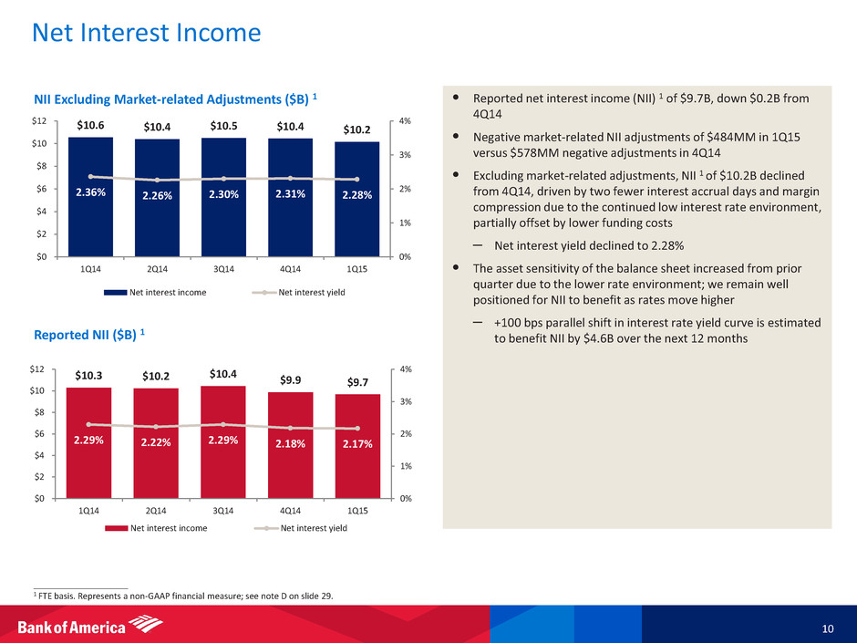 • Long-term debt decreased $5B from 4Q14 as maturities outpaced new issuances – Issued $4B of parent long-term debt in 1Q15, including $2.5B of subordinated debt that benefits Tier 2 regulatory capital – Expect to remain opportunistic to meet future funding needs • Global Excess Liquidity Sources 3 increased to a record $478B – Parent company liquidity remains strong at $93B – Time to Required Funding 4 at 37 months • Consolidated Liquidity Coverage Ratio (LCR) exceeds 2017 requirement 5 Funding and Liquidity 9 Global Excess Liquidity Sources ($B) and Time to Required Funding (months) 3, 4 ____________________ 1 Following the BANA/FIA merger on October 1, 2014, all prior periods have been updated to include debt issued by FIA that was previously reported in Other. 2 See note K on slide 29. 3 See note L on slide 29 for definition of Global Excess Liquidity Sources. 4 See note M on slide 29 for definition of Time to Required Funding. For 1Q14 through 1Q15, we have included in the amount of unsecured contractual obligations the $8.6B liability, including estimated costs, for settlements, primarily for the previously announced BNY Mellon private-label securitization settlement. 5 The Company’s Liquidity Coverage Ratio (LCR) estimates are based on its current understanding of the final U.S. LCR rules which were issued on September 3, 2014. Long-term Debt ($B) $427 $431 $429 $439 $478 35 38 38 39 37 25 35 45 $0 $100 $200 $300 $400 $500 1Q14 2Q14 3Q14 4Q14 1Q15 Parent company Bank Other regulated entities Time to Required Funding (months) 192 194 188 186 180 37 38 38 35 37 26 25 24 22 21 $255 $257 $250 $243 $238 $0 $100 $200 $300 1Q14 2Q14 3Q14 4Q14 1Q15 Parent company Bank Other 1 Annual Contractual Maturities of Parent Long-term Debt Obligations as of 1Q15 ($B) 2 13 22 23 23 18 63 3 3 2 2 1 7 $16 $25 $25 $25 $19 $70 $0 $20 $40 $60 $80 2015 2016 2017 2018 2019 Thereafter Parent vanilla Parent structured