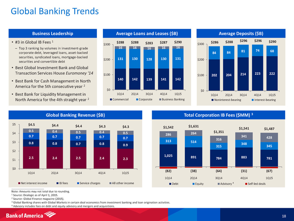 Global Banking 17 ____________________ 1 FTE basis. 2 Represents a non-GAAP financial measure. For important presentation information, see slide 31. 3 Ranking per Dealogic for the first quarter as of April 1, 2015. • [ Bullets to come ] • Net income of $1.4B, up 6% from 1Q14, as lower credit costs and reduced noninterest expense offset lower NII – NII decline from 1Q14 reflects the allocation of the negative market-related NII adjustments, push-out of costs from the firm’s LCR requirements, as well as compression in loan spreads – ROAAC remained steady at 16% 2 • Corporation-wide investment banking fees of $1.5B (excluding self-led deals) decreased 4% from 1Q14 as higher advisory and equity issuance fees were offset by lower debt issuance – Ranked #3 globally in IB fees in 1Q15 3 – Advisory fees of $0.4B, up 50% from 1Q14; highest level since merger • Provision for credit losses of $96MM in 1Q15, down $185MM from 1Q14, due to lower reserve build • Noninterest expense declined 8% from 1Q14, driven by lower technology initiatives spend, litigation costs and incentives • Average loans and leases of $289.5B, up 1% from 4Q14 – Period-end loans and leases of $295.7B increased $6.7B, or 2% from 4Q14, led by growth in C&I as well as commercial real estate $ in millions Net interest income 1 $2,265 ($155) ($242) Noninterest income 2,024 112 (4) Total revenue, net of interest expense 1 4,289 (43) (246) Provis ion for credit losses 96 127 (185) Noninterest expense 2,022 20 (168) Income tax expense 1 806 (44) 33 Net income $1,365 ($146) $74 Key Indicators ($ in billions) Average depos its $289.9 $296.2 $285.6 Average loans and leases 289.5 287.0 287.9 Net charge-off ratio 0.01 % - % (0.02) % Total corporation IB fees (excl . sel f-led) $1.49 $1.54 $1.54 Global Banking IB fees 0.85 0.83 0.82 Bus iness Lending reve ue 1.89 1.88 2.01 Global Transaction Servic s revenue 1.49 1.65 1.65 Return on average a l located capita l 2 16 % 18 % 16 % Al located capita l 2 $35.0 $33.5 $33.5 Inc/(Dec) 4Q14 1Q141Q15 1Q15 4Q14 1Q14