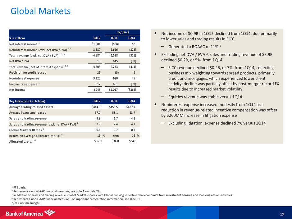 Global Banking Trends 18 ____________________ Note: Amounts may not total due to rounding. 1 Source: Dealogic as of April 1, 2015. 2 Source: Global Finance magazine (2015). 3 Global Banking shares with Global Markets in certain deal economics from investment banking and loan origination activities. 4 Advisory includes fees on debt and equity advisory and mergers and acquisitions. 202 204 214 223 222 84 84 81 74 68 $286 $288 $296 $296 $290 $0 $100 $200 $300 1Q14 2Q14 3Q14 4Q14 1Q15 Noninterest-bearing Interest-bearing 1,025 891 784 883 781 313 514 315 348 345 286 264 316 341 428 (82) (38) (64) (31) (67) $1,542 $1,631 $1,351 $1,541 $1,487 1Q14 2Q14 3Q14 4Q14 1Q15 Debt Equity Advisory Self-led deals 140 142 139 141 142 131 130 128 130 131 16 16 16 16 16 $288 $288 $283 $287 $290 $0 $100 $200 $300 1Q14 2Q14 3Q14 4Q14 1Q15 Commercial Corporate Business Banking Total Corporation IB Fees ($MM) 3 • #3 in Global IB Fees 1 – Top 3 ranking by volumes in investment-grade corporate debt, leveraged loans, asset-backed securities, syndicated loans, mortgage-backed securities and convertible debt • Best Global Investment Bank and Global Transaction Services House Euromoney ‘14 • Best Bank for Cash Management in North America for the 5th consecutive year 2 • Best Bank for Liquidity Management in North America for the 4th straight year 2 2.5 2.4 2.5 2.4 2.3 0.8 0.8 0.7 0.8 0.9 0.7 0.7 0.7 0.7 0.7 0.5 0.4 0.5 0.4 0.5 $4.5 $4.4 $4.4 $4.3 $4.3 $0 $1 $2 $3 $4 $5 1Q14 2Q14 3Q14 4Q14 1Q15 Net interest income IB fees Service charges All other income Global Banking Revenue ($B) 4 Average Deposits ($B) Business Leadership Average Loans and Leases ($B)
