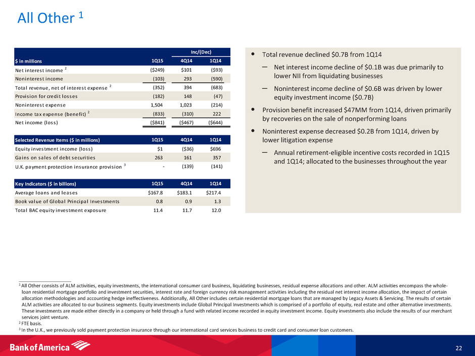 Legacy Assets & Servicing 21 • 1Q15 net loss of $0.2B improved from 1Q14, primarily due to lower litigation expense • Total revenue of $0.9B increased $0.2B from 1Q14, driven by favorable MSR net hedge results and lower representations and warranties provision • LAS expenses, excluding litigation 2, of $1.0B in 1Q15 – Expected to decline to approximately $0.8B in 4Q15 – 60+ days delinquent loans serviced down 19% from 4Q14 to 153K units in 1Q15 – LAS employees declined 9% from 4Q14 ____________________ 1 FTE basis. 2 Represents a non-GAAP financial measure; see note E on slide 29. 3 Includes other FTEs supporting LAS (contractors and offshore). $ in millions Net interest income 1 $428 $38 $51 Noninterest income 486 238 177 Total revenue, net of interest expense 1 914 276 228 Provis ion for credit losses 91 204 79 Noninterest expense, excluding l i tigation 2 1,022 (86) (542) Li tigation expense 179 (77) (5,658) Income tax expense (benefi t) 1 (140) 91 1,707 Net income (loss ) ($238) $144 $4,642 Key Indicators ($ in billions) Average loans and leases $32.4 $33.8 $38.1 MSR, end of period (EOP) 3.1 3.3 4.6 Capita l i zed MSR (bps) 68 69 87 Serviced for investors (EOP) $459 $474 $527 Total LAS mortgage banking income 0.5 0.2 0.3 1Q15 1Q14 Inc/(Dec) 1Q15 4Q14 1Q14 4Q14 277 263 221 189 153 0 50 100 150 200 250 300 1Q14 2Q14 3Q14 4Q14 1Q15 LAS Employees 3 26.2K 22.3K 18.5K 17.1K 15.5K $533 $492 $471 $461 $430 4,218 4,109 3,888 3,744 3,632 0 2,000 4,000 6,000 $0 $200 $400 $600 1Q14 2Q14 3Q14 4Q14 1Q15 Servicing fees First lien servicing portfolio Servicing Fees ($MM) and Servicing Portfolio (units in 000’s) 60+ Day Delinquent First Mortgage Loans (units in 000’s)