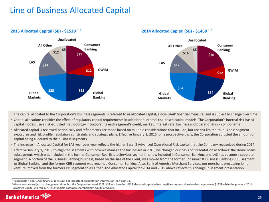 Line of Business Allocated Capital 2015 Allocated Capital ($B) - $152B 1, 2 2014 Allocated Capital ($B) - $146B 1, 2 • The capital allocated to the Corporation's business segments is referred to as allocated capital, a non-GAAP financial measure, and is subject to change over time • Capital allocations consider the effect of regulatory capital requirements in addition to internal risk-based capital models. The Corporation's internal risk-based capital models use a risk-adjusted methodology incorporating each segment's credit, market, interest rate, business and operational risk components • Allocated capital is reviewed periodically and refinements are made based on multiple considerations that include, but are not limited to, business segment exposures and risk profile, regulatory constraints and strategic plans. Effective January 1, 2015, on a prospective basis, the Corporation adjusted the amount of capital being allocated to the business segments • The increase in Allocated Capital for LAS year over year reflects the higher Basel 3 Advanced Operational Risk capital that the Company recognized during 2014 • Effective January 1, 2015, to align the segments with how we manage the businesses in 2015, we changed our basis of presentation as follows: the Home Loans subsegment, which was included in the former Consumer Real Estate Services segment, is now included in Consumer Banking, and LAS has become a separate segment. A portion of the Business Banking business, based on the size of the client, was moved from the former Consumer & Business Banking (CBB) segment to Global Banking, and the former CBB segment was renamed Consumer Banking. Also, Bank of America Merchant Services, our merchant processing joint venture, moved from the former CBB segment to All Other. The Allocated Capital for 2014 and 2015 above reflects this change in segment presentation. ____________________ 1 Represents a non-GAAP financial measure. For important presentation information, see slide 31. 2 Allocations are subject to change over time, but the Corporation used 12/31/14 as a base for 1Q15 allocated capital when tangible common shareholders’ equity was $152B while the previous 2014 allocated capital utilized 12/31/13 tangible common shareholders’ equity of $146B. $29 $12 $35 $35 $24 $12 $5 Global Banking GWIM Consumer Banking Unallocated All Other LAS Global Markets $30 $12 $34 $34 $17 $14 $5 Global Banking GWIM Consumer Banking Unallocated All Other LAS Global Markets 25