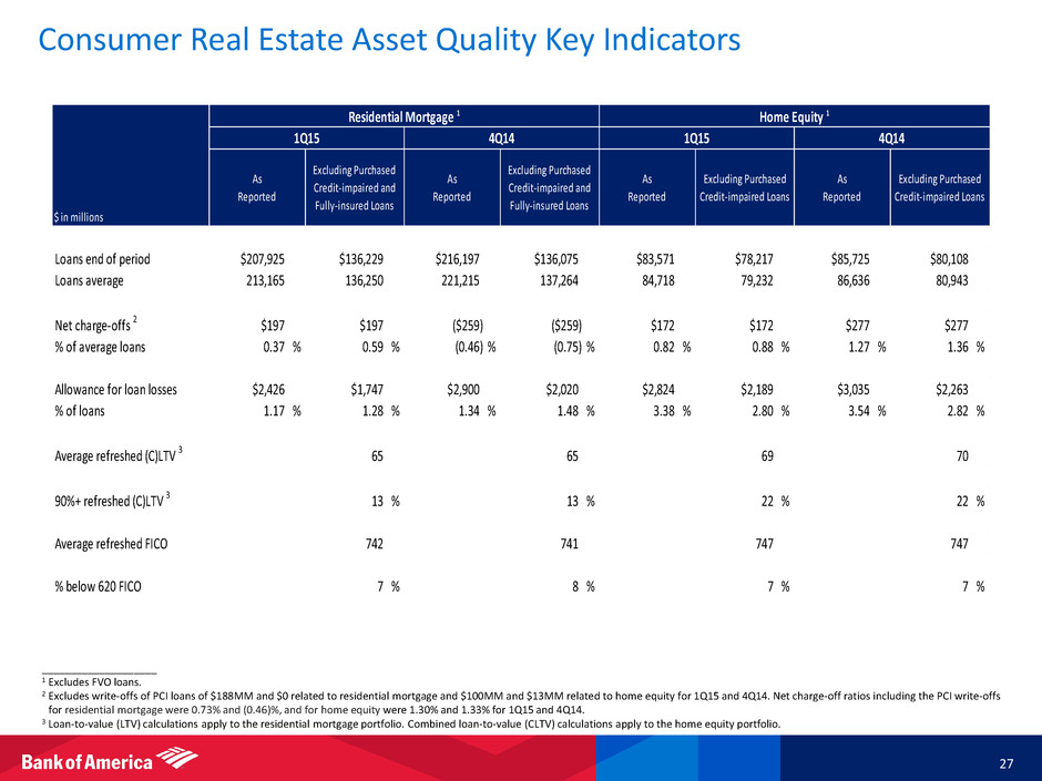 Representations and Warranties Exposure 1 26 ____________________ 1 Representations and warranties exposures do not consider exposures related to servicing (except as such losses are included as potential costs of the BNY Mellon Settlement), including foreclosure and related costs, fraud, indemnity, or claims (including for RMBS) related to securities law or monoline insurance litigations. 2 Mix for new claim trends is calculated based on last four quarters. 3 Outstanding private claims at March 31, 2015 include $13.6B of claims submitted without individual loan file reviews and the $3.4B of new claims received in 1Q15 includes $3.2B of claims submitted without individual loan file reviews. 4 In addition to the unresolved repurchase claims, the Corporation has received notifications pertaining to $2B in loans for which we have not received a repurchase request from sponsors of third-party securitizations with whom we engaged in whole- loan transactions and that we may owe indemnity obligations. 5 Represents more than one claim outstanding related to a loan. Included in March, 31, 2015 amounts were $3.3B of claims related to private label investors submitted without individual loan file reviews. 6 Level of reserves established and RPL are subject to adjustments in future periods based on a number of factors including ultimate resolution of the BNY Mellon settlement, changes in estimated repurchase rates, economic conditions, home prices, consumer and counterparty behavior, the applicable statute of limitations and a variety of judgmental factors. 7 Does not include litigation reserves established. In addition, the company currently estimates the RPL could be up to $4B over accruals at March 31, 2015, unchanged from December 31, 2014. The remaining RPL covers principally non-GSE exposures. 8 Refer to pages 51-53 of the Corporation’s 2014 Annual Report on Form 10-K on file with the SEC for additional disclosures. 9 Final conditions include receipt of a private letter ruling from the IRS. We cannot predict when or whether the conditions will be satisfied. $ in millions 1Q14 2Q14 3Q14 4Q14 1Q15 GSEs $124 $76 $70 $59 $45 Private 18,604 20,551 23,012 24,489 27,816 Monolines 1,536 1,085 1,087 1,087 1,087 Gross claims 20,264 21,712 24,169 25,635 28,948 Duplicate claims 5 (1,096) (1,714) (2,933) (3,213) (3,590) Total claims, net of duplicates $19,168 $19,998 $21,236 $22,422 $25,358 Outstanding Claims by Counterparty (UPB) 4 $ in millions 1Q14 2Q14 3Q14 Pre 2005 $96 $24 $29 $11 $28 1 % 2005 74 72 374 594 277 14 2006 973 351 307 871 2,709 43 2007 50 1,948 1,648 58 365 41 2008 11 4 4 6 11 - Post 2008 48 39 15 19 26 1 New claims $1,252 $2,438 $2,377 $1,559 $3,416 % GSEs 12 % 4 % 3 % 3 % 1 % Rescinded claims $162 $255 $47 $71 $80 Approved repurchases 177 240 88 89 81 New Claim Trends (UPB) Mix 2 4Q14 1Q15 Counterparty Original Balance Outstanding Balance Have Paid Reserves Established 6, 7 Commentary 6, 8 GSE - Whole loans $1,118 $190 FHLMC and FNMA Agreements Second-lien monoline 81 8 Completed agreements with Assured, Syncora, MBIA and FGIC Whole loans sold 55 9 Reserves established Private label (CFC issued) 409 94 BNY Mellon settlement approved on appeal; awaiting satisfaction of final conditions 9 Private l b l (non CFC bank issued) 249 38 Reserves established; Included in RPL Pri ate label (3rd party issued) 176 39 Reserves established; Included in RPL $2,088 $378 $25.8 $12.0 Reserves Established (Balances Shown for 2004-2008 Originations) ($B) 3 3