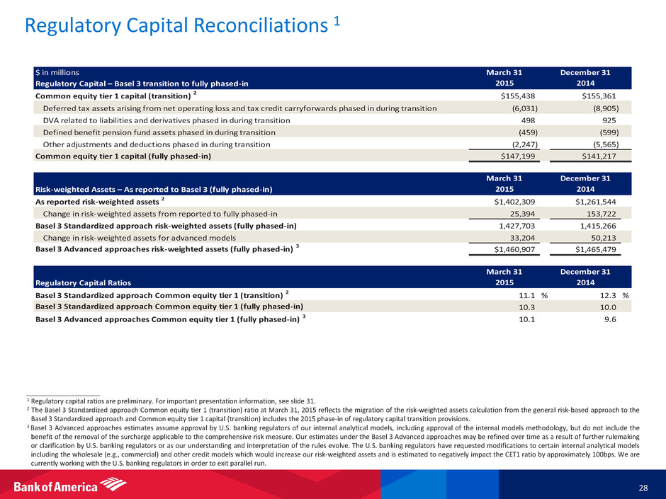 ____________________ 1 Regulatory capital ratios are preliminary. For important presentation information, see slide 31. 2 The Basel 3 Standardized approach Common equity tier 1 (transition) ratio at March 31, 2015 reflects the migration of the risk-weighted assets calculation from the general risk-based approach to the Basel 3 Standardized approach and Common equity tier 1 capital (transition) includes the 2015 phase-in of regulatory capital transition provisions. 3 Basel 3 Advanced approaches estimates assume approval by U.S. banking regulators of our internal analytical models, including approval of the internal models methodology, but do not include the benefit of the removal of the surcharge applicable to the comprehensive risk measure. Our estimates under the Basel 3 Advanced approaches may be refined over time as a result of further rulemaking or clarification by U.S. banking regulators or as our understanding and interpretation of the rules evolve. The U.S. banking regulators have requested modifications to certain internal analytical models including the wholesale (e.g., commercial) and other credit models which would increase our risk-weighted assets and is estimated to negatively impact the CET1 ratio by approximately 100bps. We are currently working with the U.S. banking regulators in order to exit parallel run. $ in millions Regulatory Capital – Basel 3 transition to fully phased-in Common equity tier 1 capital (transition) 2 $155,438 $155,361 Deferred tax assets arising from net operating loss and tax credit carryforwards phased in during transition (6,031) (8,905) DVA related to liabilities and derivatives phased in during transition 498 925 Defined benefit pension fund assets phased in during transition (459) (599) Other adjustments and deductions phased in during transition (2,247) (5,565) Common equity tier 1 capital (fully phased-in) $147,199 $141,217 Risk-weighted Assets – As reported to Basel 3 (fully phased-in) As reported risk-weighted assets 2 $1,402,309 $1,261,544 Change in risk-weighted assets from reported to fully phased-in 25,394 153,722 Basel 3 Standardized approach risk-weighted assets (fully phased-in) 1,427,703 1,415,266 Change in risk-weighted assets for advanced models 33,204 50,213 Basel 3 Advanced approaches risk-weighted assets (fully phased-in) 3 $1,460,907 $1,465,479 Regulatory Capital Ratios Basel 3 Standardized approach Common equity tier 1 (transition) 2 11.1 % 12.3 % Basel 3 Standardized approach Common equity tier 1 (fully phased-in) 10.3 10.0 Basel 3 Advanced approaches Common equity tier 1 (fully phased-in) 3 10.1 9.6 March 31 2015 March 31 2015 March 31 2015 December 31 2014 December 31 2014 December 31 2014 28 Regulatory Capital Reconciliations 1