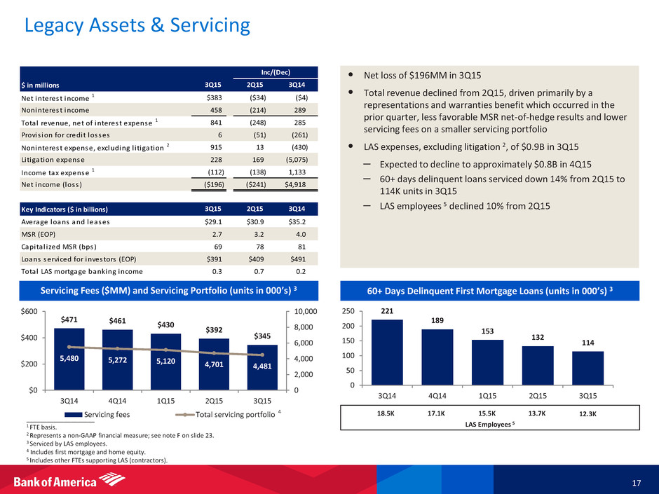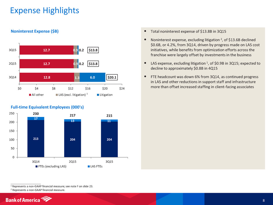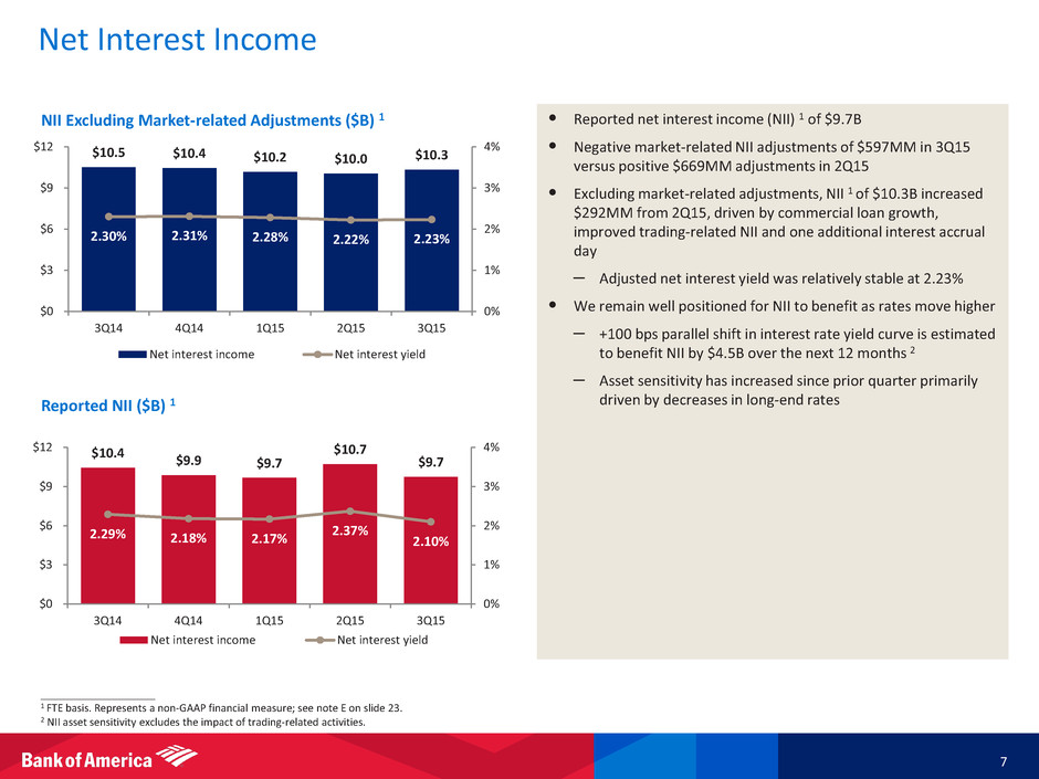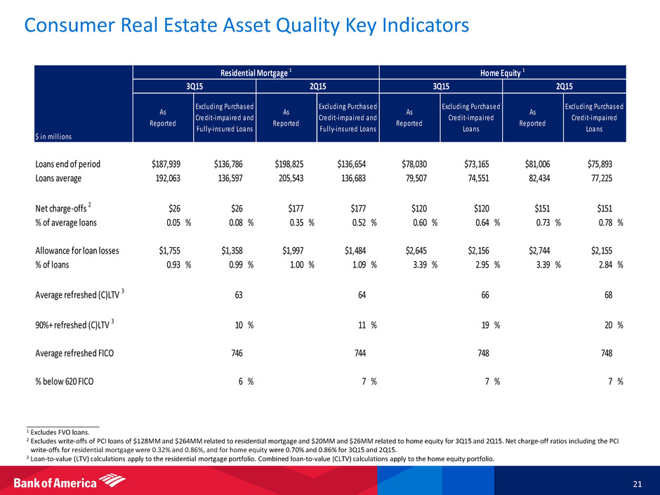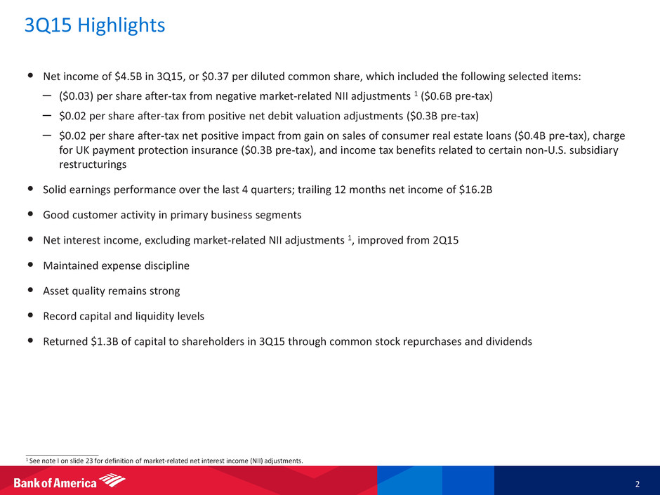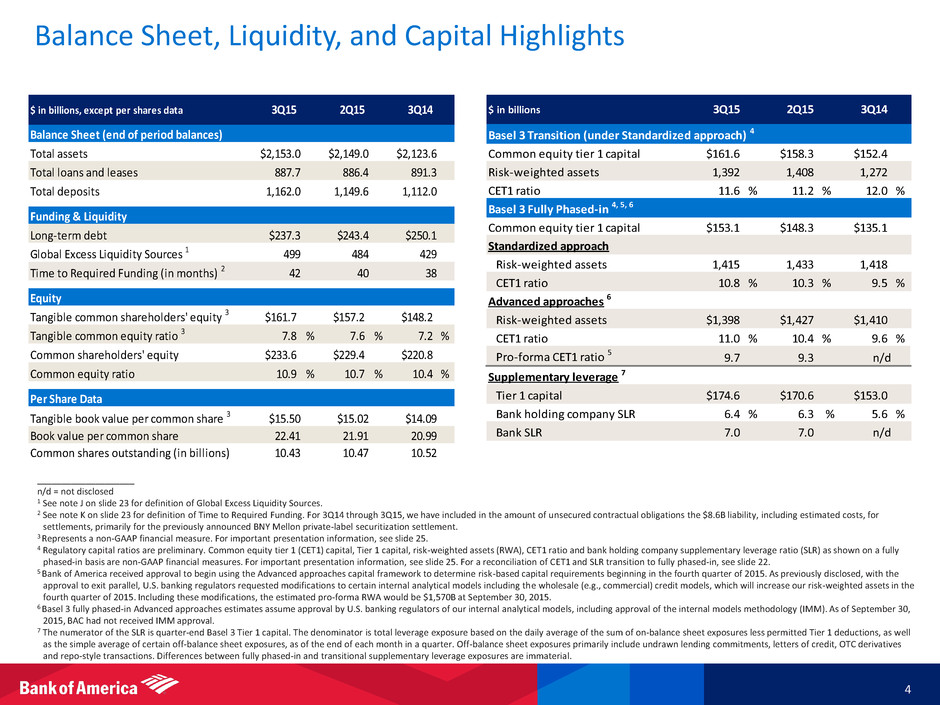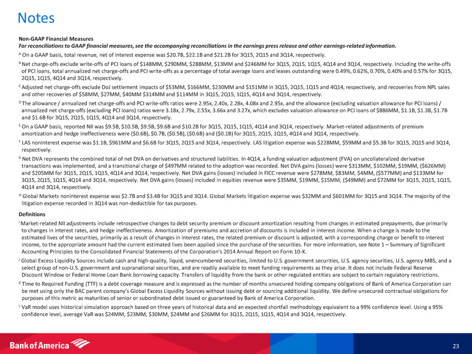 Notes 23 Non-GAAP Financial Measures For reconciliations to GAAP financial measures, see the accompanying reconciliations in the earnings press release and other earnings-related information. A On a GAAP basis, total revenue, net of interest expense was $20.7B, $22.1B and $21.2B for 3Q15, 2Q15 and 3Q14, respectively. B Net charge-offs exclude write-offs of PCI loans of $148MM, $290MM, $288MM, $13MM and $246MM for 3Q15, 2Q15, 1Q15, 4Q14 and 3Q14, respectively. Including the write-offs of PCI loans, total annualized net charge-offs and PCI write-offs as a percentage of total average loans and leases outstanding were 0.49%, 0.62%, 0.70%, 0.40% and 0.57% for 3Q15, 2Q15, 1Q15, 4Q14 and 3Q14, respectively. C Adjusted net charge-offs exclude DoJ settlement impacts of $53MM, $166MM, $230MM and $151MM in 3Q15, 2Q15, 1Q15 and 4Q14, respectively, and recoveries from NPL sales and other recoveries of $58MM, $27MM, $40MM $314MM and $114MM in 3Q15, 2Q15, 1Q15, 4Q14 and 3Q14, respectively. D The allowance / annualized net charge-offs and PCI write-offs ratios were 2.95x, 2.40x, 2.28x, 4.08x and 2.95x, and the allowance (excluding valuation allowance for PCI loans) / annualized net charge-offs (excluding PCI loans) ratios were 3.18x, 2.79x, 2.55x, 3.66x and 3.27x, which excludes valuation allowance on PCI loans of $886MM, $1.1B, $1.3B, $1.7B and $1.6B for 3Q15, 2Q15, 1Q15, 4Q14 and 3Q14, respectively. E On a GAAP basis, reported NII was $9.5B, $10.5B, $9.5B, $9.6B and $10.2B for 3Q15, 2Q15, 1Q15, 4Q14 and 3Q14, respectively. Market-related adjustments of premium amortization and hedge ineffectiveness were ($0.6B), $0.7B, ($0.5B), ($0.6B) and ($0.1B) for 3Q15, 2Q15, 1Q15, 4Q14 and 3Q14, respectively. F LAS noninterest expense was $1.1B, $961MM and $6.6B for 3Q15, 2Q15 and 3Q14, respectively. LAS litigation expense was $228MM, $59MM and $5.3B for 3Q15, 2Q15 and 3Q14, respectively. G Net DVA represents the combined total of net DVA on derivatives and structured liabilities. In 4Q14, a funding valuation adjustment (FVA) on uncollateralized derivative transactions was implemented, and a transitional charge of $497MM related to the adoption was recorded. Net DVA gains (losses) were $313MM, $102MM, $19MM, ($626MM) and $205MM for 3Q15, 2Q15, 1Q15, 4Q14 and 3Q14, respectively. Net DVA gains (losses) included in FICC revenue were $278MM, $83MM, $4MM, ($577MM) and $133MM for 3Q15, 2Q15, 1Q15, 4Q14 and 3Q14, respectively. Net DVA gains (losses) included in equities revenue were $35MM, $19MM, $15MM, ($49MM) and $72MM for 3Q15, 2Q15, 1Q15, 4Q14 and 3Q14, respectively. H Global Markets noninterest expense was $2.7B and $3.4B for 3Q15 and 3Q14. Global Markets litigation expense was $32MM and $601MM for 3Q15 and 3Q14. The majority of the litigation expense recorded in 3Q14 was non-deductible for tax purposes. Definitions I Market-related NII adjustments include retrospective changes to debt security premium or discount amortization resulting from changes in estimated prepayments, due primarily to changes in interest rates, and hedge ineffectiveness. Amortization of premiums and accretion of discounts is included in interest income. When a change is made to the estimated lives of the securities, primarily as a result of changes in interest rates, the related premium or discount is adjusted, with a corresponding charge or benefit to interest income, to the appropriate amount had the current estimated lives been applied since the purchase of the securities. For more information, see Note 1 – Summary of Significant Accounting Principles to the Consolidated Financial Statements of the Corporation’s 2014 Annual Report on Form 10-K. J Global Excess Liquidity Sources include cash and high-quality, liquid, unencumbered securities, limited to U.S. government securities, U.S. agency securities, U.S. agency MBS, and a select group of non-U.S. government and supranational securities, and are readily available to meet funding requirements as they arise. It does not include Federal Reserve Discount Window or Federal Home Loan Bank borrowing capacity. Transfers of liquidity from the bank or other regulated entities are subject to certain regulatory restrictions. K Time to Required Funding (TTF) is a debt coverage measure and is expressed as the number of months unsecured holding company obligations of Bank of America Corporation can be met using only the BAC parent company’s Global Excess Liquidity Sources without issuing debt or sourcing additional liquidity. We define unsecured contractual obligations for purposes of this metric as maturities of senior or subordinated debt issued or guaranteed by Bank of America Corporation. L VaR model uses historical simulation approach based on three years of historical data and an expected shortfall methodology equivalent to a 99% confidence level. Using a 95% confidence level, average VaR was $24MM, $23MM, $30MM, $24MM and $26MM for 3Q15, 2Q15, 1Q15, 4Q14 and 3Q14, respectively.