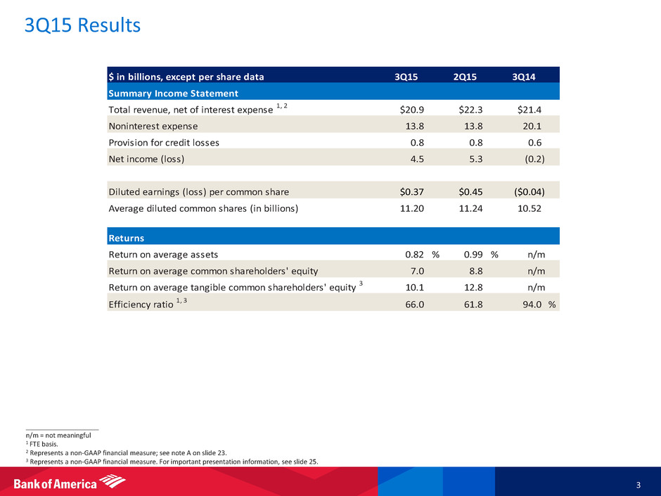 3Q15 Highlights 2 • Net income of $4.5B in 3Q15, or $0.37 per diluted common share, which included the following selected items: – ($0.03) per share after-tax from negative market-related NII adjustments 1 ($0.6B pre-tax) – $0.02 per share after-tax from positive net debit valuation adjustments ($0.3B pre-tax) – $0.02 per share after-tax net positive impact from gain on sales of consumer real estate loans ($0.4B pre-tax), charge for UK payment protection insurance ($0.3B pre-tax), and income tax benefits related to certain non-U.S. subsidiary restructurings • Solid earnings performance over the last 4 quarters; trailing 12 months net income of $16.2B • Good customer activity in primary business segments • Net interest income, excluding market-related NII adjustments 1, improved from 2Q15 • Maintained expense discipline • Asset quality remains strong • Record capital and liquidity levels • Returned $1.3B of capital to shareholders in 3Q15 through common stock repurchases and dividends ____________________ 1 See note I on slide 23 for definition of market-related net interest income (NII) adjustments.