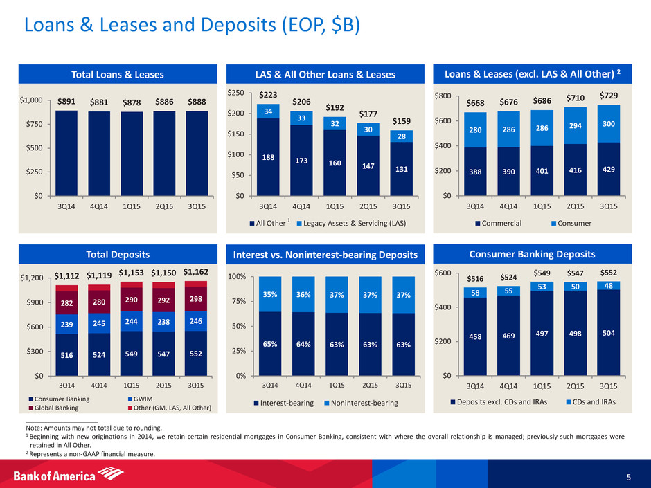 Balance Sheet, Liquidity, and Capital Highlights 4 $ in billions, except per shares data Balance Sheet (end of period balances) Total assets $2,153.0 $2,149.0 $2,123.6 Total loans and leases 887.7 886.4 891.3 Total deposits 1,162.0 1,149.6 1,112.0 Funding & Liquidity Long-term debt $237.3 $243.4 $250.1 Global Excess Liquidity Sources 1 499 484 429 Time to Required Funding (in months) 2 42 40 38 Equity Tangible common shareholders' equity 3 $161.7 $157.2 $148.2 Tangible common equity ratio 3 7.8 % 7.6 % 7.2 % Common shareholders' equity $233.6 $229.4 $220.8 Common equity ratio 10.9 % 10.7 % 10.4 % Per Share Data Tangible book value per common share 3 $15.50 $15.02 $14.09 Book value per common share 22.41 21.91 20.99 Common shares outstanding (in billions) 10.43 10.47 10.52 3Q15 2Q15 3Q14 ____________________ n/d = not disclosed 1 See note J on slide 23 for definition of Global Excess Liquidity Sources. 2 See note K on slide 23 for definition of Time to Required Funding. For 3Q14 through 3Q15, we have included in the amount of unsecured contractual obligations the $8.6B liability, including estimated costs, for settlements, primarily for the previously announced BNY Mellon private-label securitization settlement. 3 Represents a non-GAAP financial measure. For important presentation information, see slide 25. 4 Regulatory capital ratios are preliminary. Common equity tier 1 (CET1) capital, Tier 1 capital, risk-weighted assets (RWA), CET1 ratio and bank holding company supplementary leverage ratio (SLR) as shown on a fully phased-in basis are non-GAAP financial measures. For important presentation information, see slide 25. For a reconciliation of CET1 and SLR transition to fully phased-in, see slide 22. 5 Bank of America received approval to begin using the Advanced approaches capital framework to determine risk-based capital requirements beginning in the fourth quarter of 2015. As previously disclosed, with the approval to exit parallel, U.S. banking regulators requested modifications to certain internal analytical models including the wholesale (e.g., commercial) credit models, which will increase our risk-weighted assets in the fourth quarter of 2015. Including these modifications, the estimated pro-forma RWA would be $1,570B at September 30, 2015. 6 Basel 3 fully phased-in Advanced approaches estimates assume approval by U.S. banking regulators of our internal analytical models, including approval of the internal models methodology (IMM). As of September 30, 2015, BAC had not received IMM approval. 7 The numerator of the SLR is quarter-end Basel 3 Tier 1 capital. The denominator is total leverage exposure based on the daily average of the sum of on-balance sheet exposures less permitted Tier 1 deductions, as well as the simple average of certain off-balance sheet exposures, as of the end of each month in a quarter. Off-balance sheet exposures primarily include undrawn lending commitments, letters of credit, OTC derivatives and repo-style transactions. Differences between fully phased-in and transitional supplementary leverage exposures are immaterial. $ in billions Basel 3 Transition (under Standardized approach) 4 Common equity tier 1 capital $161.6 $158.3 $152.4 Risk-weighted assets 1,392 1,408 1,272 CET1 ratio 11.6 % 11.2 % 12.0 % Basel 3 Fully Phased-in 4, 5, 6 Common equity tier 1 capital $153.1 $148.3 $135.1 Standardized approach Risk-weighted assets 1,415 1,433 1,418 CET1 ratio 10.8 % 10.3 % 9.5 % Advanced approaches 6 Risk-weighted assets $1,398 $1,427 $1,410 CET1 ratio 11.0 % 10.4 % 9.6 % Pr -forma CET1 ratio 5 9.7 9.3 n/d Supplementary leverage 7 Tier 1 capital $174.6 $170.6 $153.0 Bank holding company SLR 6.4 % 6.3 % 5.6 % Bank SLR 7.0 7.0 n/d 3Q15 2Q15 3Q14