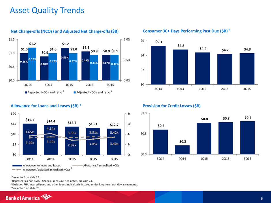 Loans & Leases and Deposits (EOP, $B) 5 ____________________ Note: Amounts may not total due to rounding. 1 Beginning with new originations in 2014, we retain certain residential mortgages in Consumer Banking, consistent with where the overall relationship is managed; previously such mortgages were retained in All Other. 2 Represents a non-GAAP financial measure. Total Loans & Leases LAS & All Other Loans & Leases $891 $881 $878 $886 $888 $0 $250 $500 $750 $1,000 3Q14 4Q14 1Q15 2Q15 3Q15 188 173 160 147 131 34 33 32 30 28 $223 $206 $192 $177 $159 $0 $50 $100 $150 $200 $250 3Q14 4Q14 1Q15 2Q15 3Q15 All Other Legacy Assets & Servicing (LAS) 388 390 401 416 429 280 286 286 294 300 $668 $676 $686 $710 $729 $0 $200 $400 $600 $800 3Q14 4Q14 1Q15 2Q15 3Q15 Commercial Consumer Consumer Banking Deposits 458 469 497 498 504 58 55 53 50 48 $516 $524 $549 $547 $552 $0 $200 $400 $600 3Q14 4Q14 1Q15 2Q15 3Q15 Deposits excl. CDs and IRAs CDs and IRAs Total Deposits 516 524 549 547 552 239 245 244 238 246 282 280 290 292 298 $1,112 $1,119 $1,153 $1,150 $1,162 $0 $300 $600 $900 $1,200 3Q14 4Q14 1Q15 2Q15 3Q15 Consumer Banking GWIM Global Banking Other (GM, LAS, All Other) Interest vs. Noninterest-bearing Deposits 65% 64% 63% 63% 63% 35% 36% 37% 37% 37% 0% 25% 50% 75% 100% 3Q14 4Q14 1Q15 2Q15 3Q15 Interest-bearing Noninterest-bearing 1 Loans & Leases (excl. LAS & All Other) 2