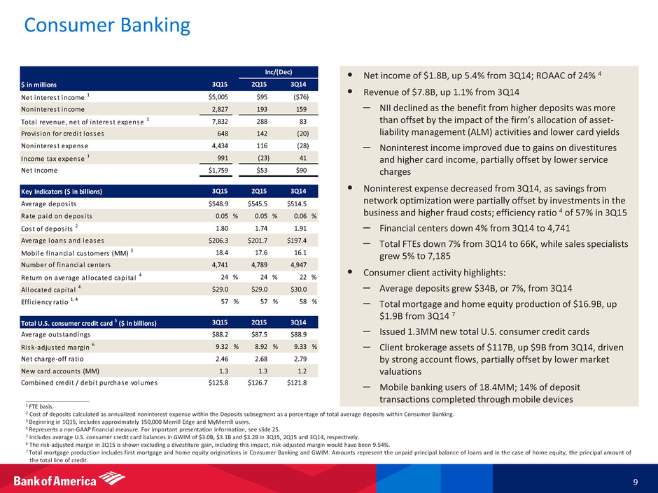 12.8 12.7 12.7 1.3 0.9 0.9 6.0 0.2 0.2 $20.1 $13.8 $13.8 $0 $4 $8 $12 $16 $20 $24 3Q14 2Q15 3Q15 All other LAS (excl. litigation) Litigation Expense Highlights ____________________ 1 Represents a non-GAAP financial measure; see note F on slide 23. 2 Represents a non-GAAP financial measure. • Total noninterest expense of $13.8B in 3Q15 • Noninterest expense, excluding litigation 2, of $13.6B declined $0.6B, or 4.2%, from 3Q14, driven by progress made on LAS cost initiatives, while benefits from optimization efforts across the franchise were largely offset by investments in the business • LAS expense, excluding litigation 1, of $0.9B in 3Q15; expected to decline to approximately $0.8B in 4Q15 • FTE headcount was down 6% from 3Q14, as continued progress in LAS and other reductions in support staff and infrastructure more than offset increased staffing in client-facing associates Noninterest Expense ($B) Full-time Equivalent Employees (000's) 8 1 213 204 204 17 13 11 230 217 215 0 50 100 150 200 250 3Q14 2Q15 3Q15 FTEs (excluding LAS) LAS FTEs