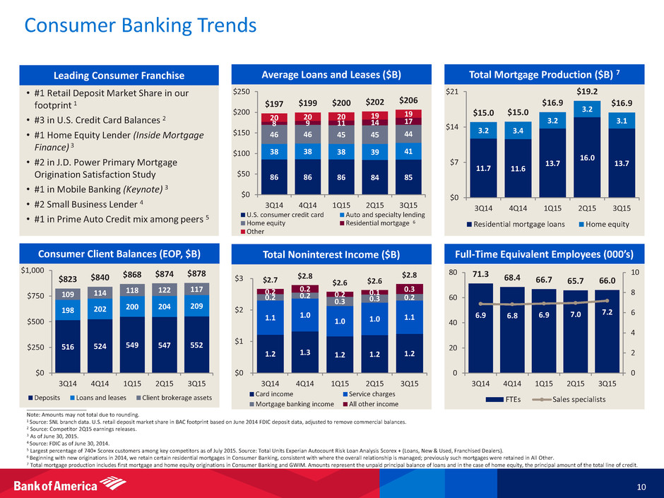 Consumer Banking 9 ____________________ 1 FTE basis. 2 Cost of deposits calculated as annualized noninterest expense within the Deposits subsegment as a percentage of total average deposits within Consumer Banking. 3 Beginning in 1Q15, includes approximately 150,000 Merrill Edge and MyMerrill users. 4 Represents a non-GAAP financial measure. For important presentation information, see slide 25. 5 Includes average U.S. consumer credit card balances in GWIM of $3.0B, $3.1B and $3.2B in 3Q15, 2Q15 and 3Q14, respectively. 6 The risk-adjusted margin in 3Q15 is shown excluding a divestiture gain, including this impact, risk-adjusted margin would have been 9.54%. 7 Total mortgage production includes first mortgage and home equity originations in Consumer Banking and GWIM. Amounts represent the unpaid principal balance of loans and in the case of home equity, the principal amount of the total line of credit. • [ Bullets to come ] • Net income of $1.8B, up 5.4% from 3Q14; ROAAC of 24% 4 Revenue f $7.8B, up 1.1% from 3Q14 – NII declined as the benefit from higher deposits was more than offset by the impact of the firm’s allocation of asset- liability management (ALM) activities and lower card yields – Noninterest income improved due to gains on divestitures and higher card income, partially offset by lower service charges • Noninterest expense decreased from 3Q14, as savings from network optimization were partially offset by investments in the business and higher fraud costs; efficiency ratio 4 of 57% in 3Q15 – Financial centers down 4% from 3Q14 to 4,741 – Total FTEs down 7% from 3Q14 to 66K, while sales specialists grew 5% to 7,185 • Consumer client activity highlights: – Average deposits grew $34B, or 7%, from 3Q14 – Total mortgage and home equity production of $16.9B, up $1.9B from 3Q14 7 – Issued 1.3MM new total U.S. consumer credit cards – Client brokerage assets of $117B, up $9B from 3Q14, driven by strong account flows, partially offset by lower market valuations – Mobile banking users of 18.4MM; 14% of deposit transactions completed through mobile devices $ in millions Net interest income 1 $5,005 $95 ($76) Noninterest income 2,827 193 159 Total revenue, net of interest expense 1 7,832 288 83 Provis ion for credit losses 648 142 (20) Noninterest expense 4,434 116 (28) Income tax expense 1 991 (23) 41 Net income $1,759 $53 $90 Key Indicators ($ in billions) Average depos its $548.9 $545.5 $514.5 Rate paid on depos its 0.05 % 0.05 % 0.06 % Cost of depos its 2 1.80 1.74 1.91 Average loans and leases $206.3 $201.7 $197.4 Mobi le financia l customers (MM) 3 18.4 17.6 16.1 Number of financia l centers 4,741 4,789 4,947 Return on average a l located capita l 4 24 % 24 % 22 % Al located capita l 4 $29.0 $29.0 $30.0 Efficiency ratio 1, 4 57 % 57 % 58 % Total U.S. consumer credit card 5 ($ in billions) Average outstandings $88.2 $87.5 $88.9 Risk-adjusted margin 6 9.32 % 8.92 % 9.33 % Net charge-off ratio 2.46 2.68 2.79 New card accounts (MM) 1.3 1.3 1.2 Combined credit / debit purchase volumes $125.8 $126.7 $121.8 3Q15 2Q15 3Q14 Inc/(Dec) 3Q15 2Q15 3Q14 3Q15 2Q15 3Q14