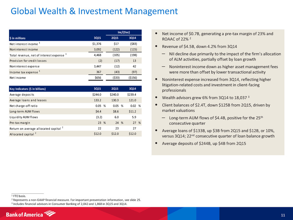 71.3 68.4 66.7 65.7 66.0 6.9 6.8 6.9 7.0 7.2 0 2 4 6 8 10 0 20 40 60 80 3Q14 4Q14 1Q15 2Q15 3Q15 Th o u sa n d s Th o u sa n d s FTEs Sales specialists Consumer Banking Trends 10 • #1 Retail Deposit Market Share in our footprint 1 • #3 in U.S. Credit Card Balances 2 • #1 Home Equity Lender (Inside Mortgage Finance) 3 • #2 in J.D. Power Primary Mortgage Origination Satisfaction Study • #1 in Mobile Banking (Keynote) 3 • #2 Small Business Lender 4 • #1 in Prime Auto Credit mix among peers 5 1.2 1.3 1.2 1.2 1.2 1.1 1.0 1.0 1.0 1.1 0.2 0.2 0.3 0.3 0.2 0.2 0.2 0.2 0.1 0.3 $2.7 $2.8 $2.6 $2.6 $2.8 $0 $1 $2 $3 3Q14 4Q14 1Q15 2Q15 3Q15 Card income Service charges Mortgage banking income All other income 11.7 11.6 13.7 16.0 13.7 3.2 3.4 3.2 3.2 3.1 $15.0 $15.0 $16.9 $19.2 $16.9 $0 $7 $14 $21 3Q14 4Q14 1Q15 2Q15 3Q15 Residential mortgage loans Home equity 516 524 549 547 552 198 202 200 204 209 109 114 118 122 117 $823 $840 $868 $874 $878 $0 $250 $500 $750 $1,000 3Q14 4Q14 1Q15 2Q15 3Q15 Deposits Loans and leases Client brokerage assets ____________________ Note: Amounts may not total due to rounding. 1 Source: SNL branch data. U.S. retail deposit market share in BAC footprint based on June 2014 FDIC deposit data, adjusted to remove commercial balances. 2 Source: Competitor 2Q15 earnings releases. 3 As of June 30, 2015. 4 Source: FDIC as of June 30, 2014. 5 Largest percentage of 740+ Scorex customers among key competitors as of July 2015. Source: Total Units Experian Autocount Risk Loan Analysis Scorex + (Loans, New & Used, Franchised Dealers). 6 Beginning with new originations in 2014, we retain certain residential mortgages in Consumer Banking, consistent with where the overall relationship is managed; previously such mortgages were retained in All Other. 7 Total mortgage production includes first mortgage and home equity originations in Consumer Banking and GWIM. Amounts represent the unpaid principal balance of loans and in the case of home equity, the principal amount of the total line of credit. 86 86 86 84 85 38 38 38 39 41 46 46 45 45 44 8 9 11 14 17 20 20 20 19 19 $197 $199 $200 $202 $206 $0 $50 $100 $150 $200 $250 3Q14 4Q14 1Q15 2Q15 3Q15 U.S. consumer credit card Auto and specialty lending Home equity Residential mortgage Other Leading Consumer Franchise Total Mortgage Production ($B) 7 Average Loans and Leases ($B) Total Noninterest Income ($B) Consumer Client Balances (EOP, $B) Full-Time Equivalent Employees (000’s) 6