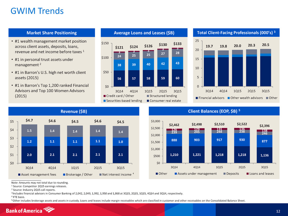 Global Wealth & Investment Management 11 ____________________ 1 FTE basis. 2 Represents a non-GAAP financial measure. For important presentation information, see slide 25. 3 Includes financial advisors in Consumer Banking of 2,042 and 1,868 in 3Q15 and 3Q14. • Net income of $0.7B, generating a pre-tax margin of 23% and ROAAC of 22% 2 • Revenue of $4.5B, down 4.2% from 3Q14 – NII decline due primarily to the impact of the firm’s allocation of ALM activities, partially offset by loan growth – Noninterest income down as higher asset management fees were more than offset by lower transactional activity • Noninterest expense increased from 3Q14, reflecting higher litigation-related costs and investment in client-facing professionals • Wealth advisors grew 6% from 3Q14 to 18,037 3 • Client balances of $2.4T, down $125B from 2Q15, driven by market valuations – Long-term AUM flows of $4.4B, positive for the 25th consecutive quarter • Average loans of $133B, up $3B from 2Q15 and $12B, or 10%, versus 3Q14; 22nd consecutive quarter of loan balance growth • Average deposits of $244B, up $4B from 2Q15 $ in millions Net interest income 1 $1,376 $17 ($83) Noninterest income 3,092 (122) (115) Total revenue, net of interest expense 1 4,468 (105) (198) Provis ion for credit losses (2) (17) 13 Noninterest expense 3,447 (12) 42 Income tax expense 1 367 (43) (97) Net income $656 ($33) ($156) Key Indicators ($ in billions) Average depos its $244.0 $240.0 $239.4 Average loans and leases 133.2 130.3 121.0 Net charge-off ratio 0.05 % 0.05 % 0.02 % Long-term AUM flows $4.4 $8.6 $11.2 Liquidi ty AUM flows (3.2) 6.0 5.9 Pre-tax margin 23 % 24 % 27 % Return on average a l l cated capita l 2 22 23 27 Al located capita l 2 $12.0 $12.0 $12.0 Inc/(Dec) 3Q15 2Q15 3Q14 3Q15 2Q15 3Q14