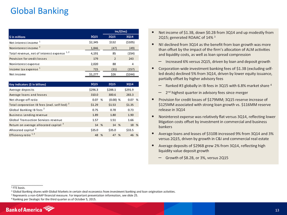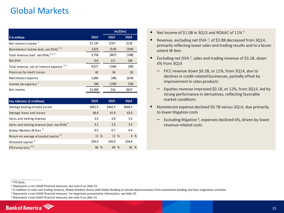 Global Banking Trends 14 ____________________ Note: Amounts may not total due to rounding. 1 Ranking per Dealogic for the third quarter as of October 5, 2015. 2 Source: Global Finance magazine (2015). 3 Global Banking shares with Global Markets in certain deal economics from investment banking and loan origination activities. 4 FTE basis. 5 Advisory includes fees on debt and equity advisory and mergers and acquisitions. 73% 76% 77% 77% 78% 27% 24% 23% 23% 22% $292 $292 $286 $288 $296 $0 $50 $100 $150 $200 $250 $300 $350 3Q14 4Q14 1Q15 2Q15 3Q15 Noninterest-bearing Interest-bearing 784 883 781 887 748 315 348 345 417 188 316 341 428 276 391 (64) (31) (67) (54) (40) $1,351 $1,541 $1,487 $1,526 $1,287 3Q14 4Q14 1Q15 2Q15 3Q15 Debt Equity Advisory Self-led deals Total Corporation IB Fees ($MM) 3 • #3 in Global IB Fees 1 – Top 3 ranking by volumes in investment-grade corporate debt, leveraged loans, asset-backed securities, syndicated loans, HY corporate debt, mortgage-backed securities & convertible debt • Best Global Transaction Services and Global Loan House (Euromoney ’15) • Best Bank for Cash Management in North America for the 5th consecutive year 2 • Most Innovative Investment Bank from North America (The Banker ’15) • Relationships with 82% of the Global Fortune 500; 97% of the U.S. Fortune 1,000 (2014) 2.5 2.4 2.3 2.2 2.3 0.7 0.8 0.9 0.8 0.8 0.7 0.7 0.7 0.7 0.7 0.4 0.4 0.4 0.4 0.3 $4.3 $4.3 $4.3 $4.1 $4.2 $0 $1 $2 $3 $4 $5 3Q14 4Q14 1Q15 2Q15 3Q15 Net interest income IB fees Service charges All other income Revenue ($B) 3 5 Average Deposits ($B) Business Leadership Average Loans and Leases ($B) 139 141 142 147 150 128 130 131 137 143 16 16 16 17 17 $283 $287 $290 $301 $310 $0 $50 $100 $150 $200 $250 $300 $350 3Q14 4Q14 1Q15 2Q15 3Q15 Commercial Corporate Business Banking 4