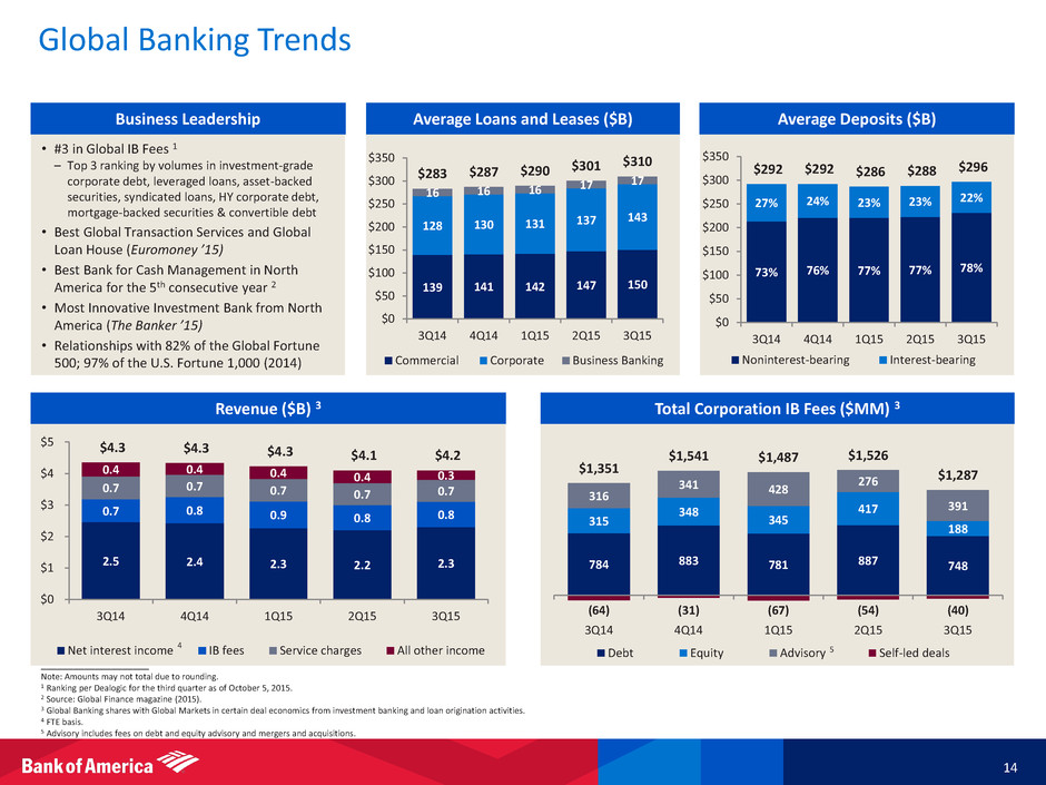 Global Banking 13 ____________________ 1 FTE basis. 2 Global Banking shares with Global Markets in certain deal economics from investment banking and loan origination activities. 3 Represents a non-GAAP financial measure. For important presentation information, see slide 25. 4 Ranking per Dealogic for the third quarter as of October 5, 2015. • [ Bullets to come ] • Net income of $1.3B, down $0.2B from 3Q14 and up modestly from 2Q15; generated ROAAC of 14% 3 • NII declined from 3Q14 as the benefit from loan growth was more than offset by the impact of the firm’s allocation of ALM activities and liquidity costs, as well as loan spread compression – Increased 6% versus 2Q15, driven by loan and deposit growth • Corporation-wide investment banking fees of $1.3B (excluding self- led deals) declined 5% from 3Q14, driven by lower equity issuance, partially offset by higher advisory fees – Ranked #3 globally in IB fees in 3Q15 with 6.8% market share 4 – 2nd highest quarter in advisory fees since merger • Provision for credit losses of $179MM; 3Q15 reserve increase of $125MM associated with strong loan growth vs. $116MM reserve release in 3Q14 • Noninterest expense was relatively flat versus 3Q14, reflecting lower litigation costs offset by investment in commercial and business bankers • Average loans and leases of $310B increased 9% from 3Q14 and 3% versus 2Q15, driven by growth in C&I and commercial real estate • Average deposits of $296B grew 2% from 3Q14, reflecting high liquidity value deposit growth – Growth of $8.2B, or 3%, versus 2Q15 $ in millions Net interest income 1 $2,345 $132 ($105) Noninterest income 2 1,846 (47) (49) Total revenue, net of interest expense 1, 2 4,191 85 (154) Provis ion for credit losses 179 2 243 Noninterest expense 2,020 88 4 Income tax expense 1 715 (31) (157) Net income $1,277 $26 ($244) Key Indicators ($ in billions) Average depos its $296.3 $288.1 $291.9 Average loans and leases 310.0 300.6 283.3 Net charge-off ratio 0.07 % (0.00) % 0.07 % Total corporation IB fees (excl . sel f-led) 2 $1.29 $1.53 $1.35 Global Banking IB fees 2 0.75 0.78 0.73 Bus iness Lending revenue 1.89 1.80 1.90 Global Transaction Services revenu 1.57 1.51 1.66 Return on average a l loca ed capita l 3 14 % 14 % 18 % Al located capita l 3 $35.0 $35.0 $33.5 Efficiency ratio 1, 3 48 % 47 % 46 % Inc/(Dec) 2Q15 3Q143Q15 3Q15 2Q15 3Q14
