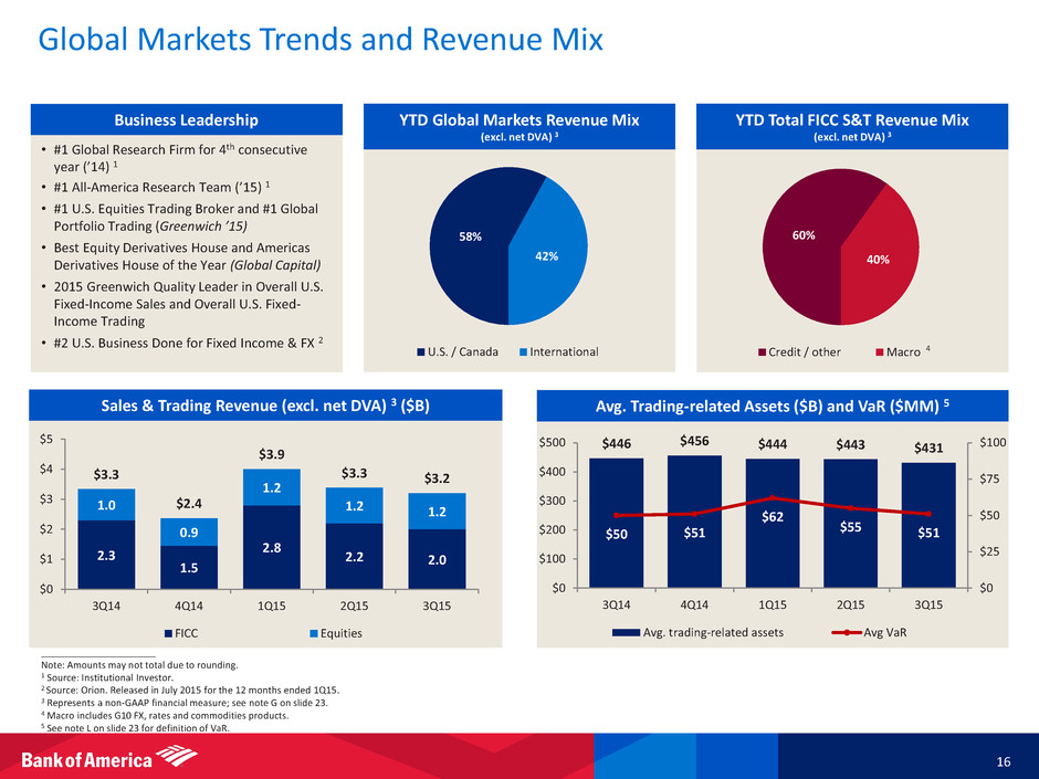 Global Markets 15 • [ Bullets to come ] ____________________ 1 FTE basis. 2 Represents a non-GAAP financial measure; see note G on slide 23. 3 In addition to sales and trading revenue, Global Markets shares with Global Banking in certain deal economics from investment banking and loan origination activities. 4 Represents a non-GAAP financial measure. For important presentation information, see slide 25. 5 Represents a non-GAAP financial measure; see note H on slide 23. • Net income of $1.0B in 3Q15 and ROAAC of 11% 4 Revenue, excluding net DVA 2, of $3.8B decreased from 3Q14, primarily reflecting lower sales and trading results and to a lesser extent IB fees • Excluding net DVA 2, sales and trading revenue of $3.2B, down 4% from 3Q14 – FICC revenue down $0.2B, or 11%, from 3Q14, due to declines in credit-related businesses, partially offset by improvement in rates products – Equities revenue improved $0.1B, or 12%, from 3Q14, led by strong performance in derivatives, reflecting favorable market conditions • Noninterest expense declined $0.7B versus 3Q14, due primarily to lower litigation costs – Excluding litigation 5, expenses declined 4%, driven by lower revenue-related costs $ in millions Net interest income 1 $1,135 $107 $136 Noninterest income (excl . net DVA) 2, 3 2,623 (514) (334) Total revenue (excl . net DVA) 1, 2, 3 3,758 (407) (198) Net DVA 313 211 108 Total revenue, net of interest expense 1, 3 4,071 (196) (90) Provis ion for credit losses 42 36 (3) Noninterest expense 2,683 (49) (674) Income tax expense 1 338 (199) (50) Net income $1,008 $16 $637 Key Indicators ($ in billions) Average trading-related assets $431.5 $442.5 $446.5 Average loans and leases 66.4 61.9 63.0 Sales and trading revenue 3.5 3.4 3.5 Sales and trading re nu (excl . net DVA) 2 3.2 3.3 3.3 Global Markets IB fees 3 0.5 0.7 0.6 Return on average a l l cated capita l 4 11 % 11 % 4 % Al located capita l 4 $35.0 $35.0 $34.0 Efficiency ratio 1, 4 66 % 64 % 81 % Inc/(Dec) 3Q15 2Q15 3Q14 3Q15 2Q15 3Q14