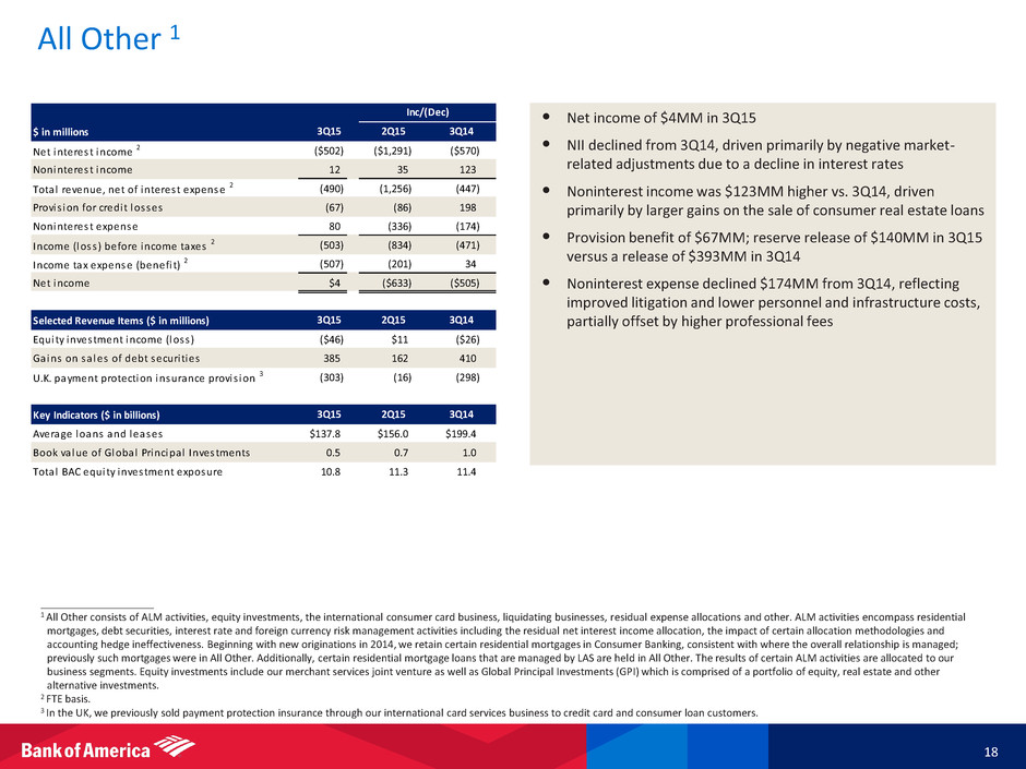 Legacy Assets & Servicing 17 • Net loss of $196MM in 3Q15 • Total revenue declined from 2Q15, driven primarily by a representations and warranties benefit which occurred in the prior quarter, less favorable MSR net-of-hedge results and lower servicing fees on a smaller servicing portfolio • LAS expenses, excluding litigation 2, of $0.9B in 3Q15 – Expected to decline to approximately $0.8B in 4Q15 – 60+ days delinquent loans serviced down 14% from 2Q15 to 114K units in 3Q15 – LAS employees 5 declined 10% from 2Q15 ____________________ 1 FTE basis. 2 Represents a non-GAAP financial measure; see note F on slide 23. 3 Serviced by LAS employees. 4 Includes first mortgage and home equity. 5 Includes other FTEs supporting LAS (contractors). $ in millions Net interest income 1 $383 ($34) ($4) Noninterest income 458 (214) 289 Total revenue, net of interest expense 1 841 (248) 285 Provis ion for credit losses 6 (51) (261) Noninterest expense, excluding l i tigation 2 915 13 (430) Li tigation expense 228 169 (5,075) Income tax expense 1 (112) (138) 1,133 Net income (loss ) ($196) ($241) $4,918 Key Indicators ($ in billions) Average loans and leases $29.1 $30.9 $35.2 MSR (EOP) 2.7 3.2 4.0 Capita l i zed MSR (bps) 69 78 81 Loans serviced for investors (EOP) $391 $409 $491 Total LAS mortgage banking income 0.3 0.7 0.2 3Q15 3Q14 Inc/(Dec) 3Q15 2Q15 3Q14 2Q15 221 189 153 132 114 0 50 100 150 200 250 3Q14 4Q14 1Q15 2Q15 3Q15 LAS Employees 5 18.5K 17.1K 15.5K 13.7K 12.3K $471 $461 $430 $392 $345 5,480 5,272 5,120 4,701 4,481 0 2,000 4,000 6,000 8,000 10,000 $0 $200 $400 $600 3Q14 4Q14 1Q15 2Q15 3Q15 Servicing fees Total servicing portfolio Servicing Fees ($MM) and Servicing Portfolio (units in 000’s) 3 60+ Days Delinquent First Mortgage Loans (units in 000’s) 3 4
