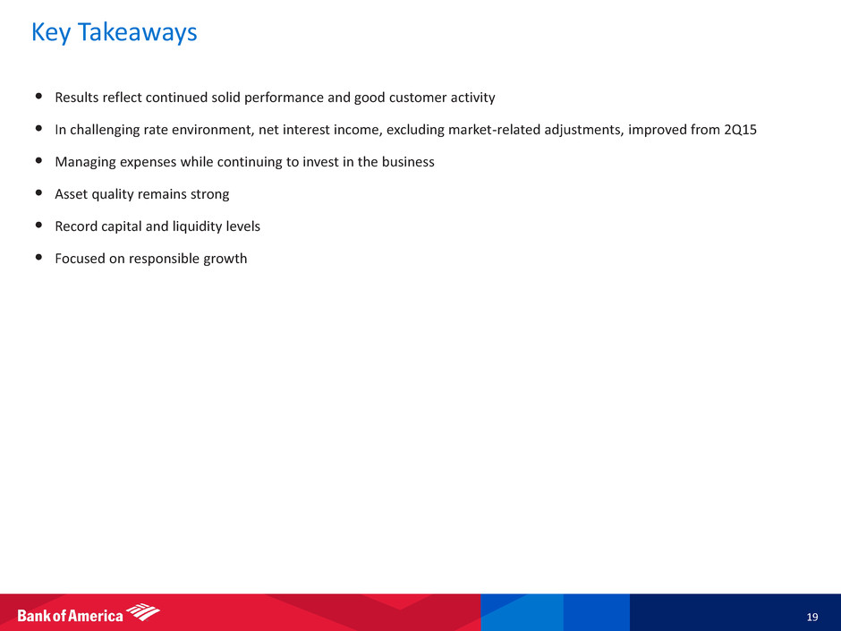 • Net income of $4MM in 3Q15 • NII declined from 3Q14, driven primarily by negative market- related adjustments due to a decline in interest rates • Noninterest income was $123MM higher vs. 3Q14, driven primarily by larger gains on the sale of consumer real estate loans • Provision benefit of $67MM; reserve release of $140MM in 3Q15 versus a release of $393MM in 3Q14 • Noninterest expense declined $174MM from 3Q14, reflecting improved litigation and lower personnel and infrastructure costs, partially offset by higher professional fees ____________________ 1 All Other consists of ALM activities, equity investments, the international consumer card business, liquidating businesses, residual expense allocations and other. ALM activities encompass residential mortgages, debt securities, interest rate and foreign currency risk management activities including the residual net interest income allocation, the impact of certain allocation methodologies and accounting hedge ineffectiveness. Beginning with new originations in 2014, we retain certain residential mortgages in Consumer Banking, consistent with where the overall relationship is managed; previously such mortgages were in All Other. Additionally, certain residential mortgage loans that are managed by LAS are held in All Other. The results of certain ALM activities are allocated to our business segments. Equity investments include our merchant services joint venture as well as Global Principal Investments (GPI) which is comprised of a portfolio of equity, real estate and other alternative investments. 2 FTE basis. 3 In the UK, we previously sold payment protection insurance through our international card services business to credit card and consumer loan customers. 18 All Other 1 $ in millions Net interest income 2 ($502) ($1,291) ($570) Noninterest income 12 35 123 Total revenue, net of interest expense 2 (490) (1,256) (447) Provis ion for credit losses (67) (86) 198 Noninterest expense 80 (336) (174) Income (loss ) before income taxes 2 (503) (834) (471) Income tax expense (benefi t) 2 (507) (201) 34 Net income $4 ($633) ($505) Selected Revenue Items ($ in millions) Equity investment income (loss ) ($46) $11 ($26) Gains on sa les of debt securi ties 385 162 410 U.K. payment protection insurance provis ion 3 (303) (16) (298) Key Indicators ($ in billions) Average loans and leases $137.8 $156.0 $199.4 Book va lue of Global Principal Investments 0.5 0.7 1.0 Total BAC equity investment exposure 10.8 11.3 11.4 Inc/(Dec) 2Q15 3Q14 3Q15 2Q15 3Q14 3Q15 3Q15 2Q15 3Q14