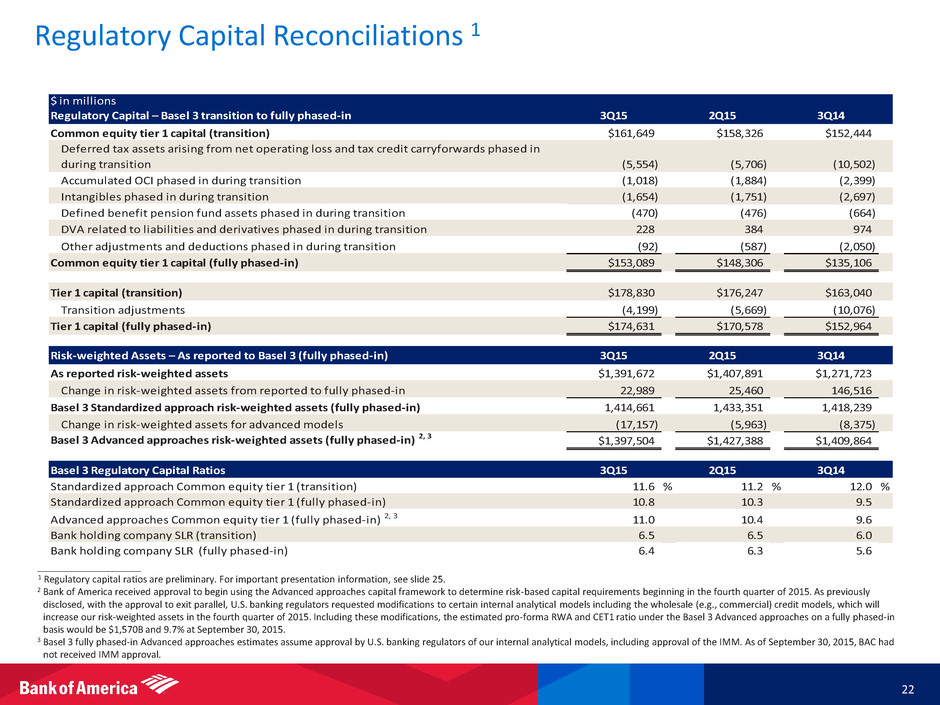____________________ 1 Regulatory capital ratios are preliminary. For important presentation information, see slide 25. 2 Bank of America received approval to begin using the Advanced approaches capital framework to determine risk-based capital requirements beginning in the fourth quarter of 2015. As previously disclosed, with the approval to exit parallel, U.S. banking regulators requested modifications to certain internal analytical models including the wholesale (e.g., commercial) credit models, which will increase our risk-weighted assets in the fourth quarter of 2015. Including these modifications, the estimated pro-forma RWA and CET1 ratio under the Basel 3 Advanced approaches on a fully phased-in basis would be $1,570B and 9.7% at September 30, 2015. 3 Basel 3 fully phased-in Advanced approaches estimates assume approval by U.S. banking regulators of our internal analytical models, including approval of the IMM. As of September 30, 2015, BAC had not received IMM approval. $ in millions Regulatory Capital – Basel 3 transition to fully phased-in 3Q15 2Q15 3Q14 Common equity tier 1 capital (transition) $161,649 $158,326 $152,444 Deferred tax assets arising from net operating loss and tax credit carryforwards phased in during transition (5,554) (5,706) (10,502) Accumulated OCI phased in during transition (1,018) (1,884) (2,399) Intangibles phased in during transition (1,654) (1,751) (2,697) Defined benefit pension fund assets phased in during transition (470) (476) (664) DVA related to liabilities and derivatives phased in during transition 228 384 974 Other adjustments and deductions phased in during transition (92) (587) (2,050) Common equity tier 1 capital (fully phased-in) $153,089 $148,306 $135,106 Tier 1 capital (transition) $178,830 $176,247 $163,040 Transition adjustments (4,199) (5,669) (10,076) Tier 1 capital (fully phased-in) $174,631 $170,578 $152,964 Risk-weighted Assets – As reported to Basel 3 (fully phased-in) 3Q15 2Q15 3Q14 As reported risk-weighted assets $1,391,672 $1,407,891 $1,271,723 Change in risk-weighted assets from reported to fully phased-in 22,989 25,460 146,516 Basel 3 Standardized approach risk-weighted assets (fully phased-in) 1,414,661 1,433,351 1,418,239 Change in risk-weighted assets for advanced models (17,157) (5,963) (8,375) Basel 3 Advanced approaches risk-weighted assets (fully phased-in) 2, 3 $1,397,504 $1,427,388 $1,409,864 Basel 3 Regulatory Capital Ratios 3Q15 2Q15 3Q14 Standardized approach Common equity tier 1 (transition) 11.6 % 11.2 % 12.0 % Standardized approach Common equity tier 1 (fully phased-in) 10.8 10.3 9.5 Advanced approaches Common equity tier 1 (fully phased-in) 2, 3 11.0 10.4 9.6 Bank holding company SLR (transition) 6.5 6.5 6.0 Bank holding company SLR (fully phased-in) 6.4 6.3 5.6 22 Regulatory Capital Reconciliations 1
