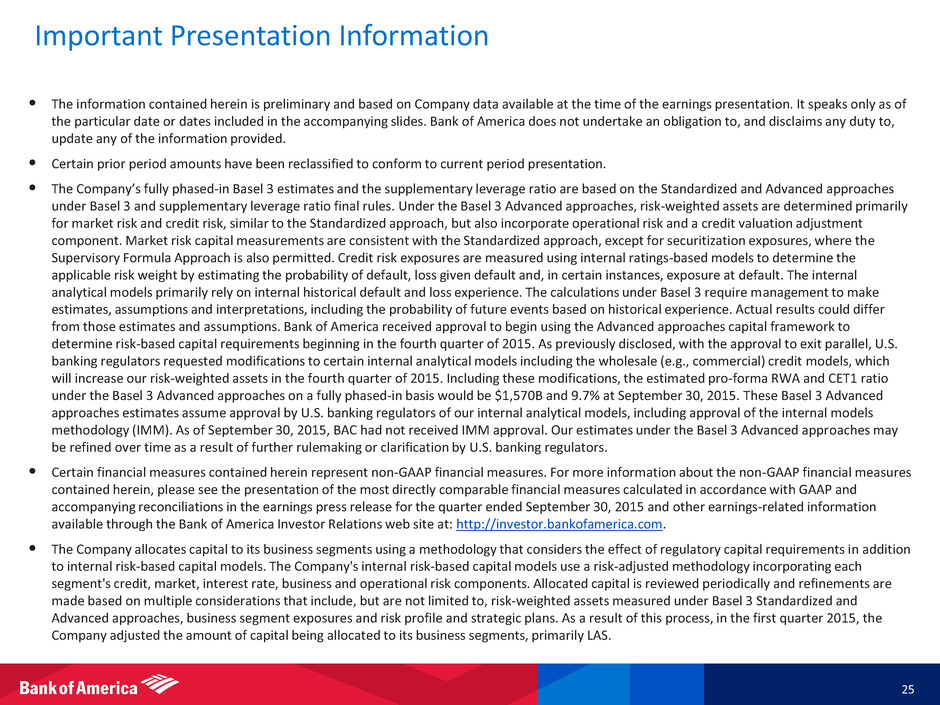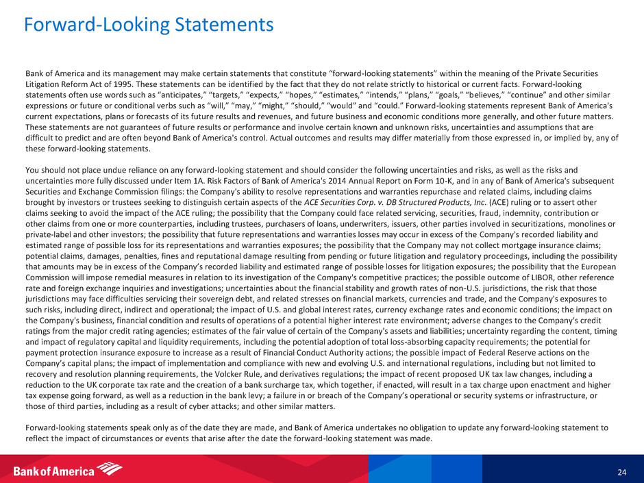 Forward-Looking Statements 24 Bank of America and its management may make certain statements that constitute “forward-looking statements” within the meaning of the Private Securities Litigation Reform Act of 1995. These statements can be identified by the fact that they do not relate strictly to historical or current facts. Forward-looking statements often use words such as “anticipates,” “targets,” “expects,” “hopes,” “estimates,” “intends,” “plans,” “goals,” “believes,” “continue” and other similar expressions or future or conditional verbs such as “will,” “may,” “might,” “should,” “would” and “could.” Forward-looking statements represent Bank of America's current expectations, plans or forecasts of its future results and revenues, and future business and economic conditions more generally, and other future matters. These statements are not guarantees of future results or performance and involve certain known and unknown risks, uncertainties and assumptions that are difficult to predict and are often beyond Bank of America's control. Actual outcomes and results may differ materially from those expressed in, or implied by, any of these forward-looking statements. You should not place undue reliance on any forward-looking statement and should consider the following uncertainties and risks, as well as the risks and uncertainties more fully discussed under Item 1A. Risk Factors of Bank of America's 2014 Annual Report on Form 10-K, and in any of Bank of America's subsequent Securities and Exchange Commission filings: the Company's ability to resolve representations and warranties repurchase and related claims, including claims brought by investors or trustees seeking to distinguish certain aspects of the ACE Securities Corp. v. DB Structured Products, Inc. (ACE) ruling or to assert other claims seeking to avoid the impact of the ACE ruling; the possibility that the Company could face related servicing, securities, fraud, indemnity, contribution or other claims from one or more counterparties, including trustees, purchasers of loans, underwriters, issuers, other parties involved in securitizations, monolines or private-label and other investors; the possibility that future representations and warranties losses may occur in excess of the Company's recorded liability and estimated range of possible loss for its representations and warranties exposures; the possibility that the Company may not collect mortgage insurance claims; potential claims, damages, penalties, fines and reputational damage resulting from pending or future litigation and regulatory proceedings, including the possibility that amounts may be in excess of the Company’s recorded liability and estimated range of possible losses for litigation exposures; the possibility that the European Commission will impose remedial measures in relation to its investigation of the Company's competitive practices; the possible outcome of LIBOR, other reference rate and foreign exchange inquiries and investigations; uncertainties about the financial stability and growth rates of non-U.S. jurisdictions, the risk that those jurisdictions may face difficulties servicing their sovereign debt, and related stresses on financial markets, currencies and trade, and the Company's exposures to such risks, including direct, indirect and operational; the impact of U.S. and global interest rates, currency exchange rates and economic conditions; the impact on the Company's business, financial condition and results of operations of a potential higher interest rate environment; adverse changes to the Company's credit ratings from the major credit rating agencies; estimates of the fair value of certain of the Company's assets and liabilities; uncertainty regarding the content, timing and impact of regulatory capital and liquidity requirements, including the potential adoption of total loss-absorbing capacity requirements; the potential for payment protection insurance exposure to increase as a result of Financial Conduct Authority actions; the possible impact of Federal Reserve actions on the Company’s capital plans; the impact of implementation and compliance with new and evolving U.S. and international regulations, including but not limited to recovery and resolution planning requirements, the Volcker Rule, and derivatives regulations; the impact of recent proposed UK tax law changes, including a reduction to the UK corporate tax rate and the creation of a bank surcharge tax, which together, if enacted, will result in a tax charge upon enactment and higher tax expense going forward, as well as a reduction in the bank levy; a failure in or breach of the Company’s operational or security systems or infrastructure, or those of third parties, including as a result of cyber attacks; and other similar matters. Forward-looking statements speak only as of the date they are made, and Bank of America undertakes no obligation to update any forward-looking statement to reflect the impact of circumstances or events that arise after the date the forward-looking statement was made.